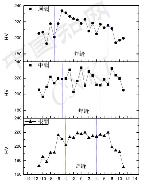 4.2.1 316L 的硬度分布圖 4-1 是 316L 焊縫頂部、中部和根部從母材到焊縫中心處的硬度分布。由圖可見,從焊縫頂部到根部整個(gè)材料中,焊縫的硬度是最高,其最大值可達(dá) 229HV;母材是最低,其最小值可低到 175HV,而且熔合線附近母材硬度和基體母材硬度相差無幾,很難分別其高低。相同的焊接接頭硬度變化規(guī)律是因?yàn)橄鄳?yīng)部分的材料相同且組織分布一樣均勻。