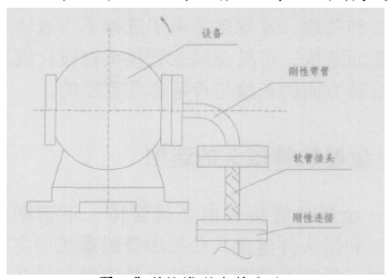 在這種安裝形式中, 由于設(shè)備的振動(dòng)方向主要為上下垂直振動(dòng), 因此, 該金屬穿線軟管主要補(bǔ)償?shù)氖瞧漭S向的位移, 我們知道金屬穿線軟管本身在自然狀態(tài)下不能補(bǔ)償軸向位移, 這樣的安裝使用結(jié)果就必然是金屬穿線軟管無法承受強(qiáng)烈的軸向拉伸而產(chǎn)生斷裂, 從而導(dǎo)致管路泄漏。正確的安裝安裝方式見圖4 、圖5。