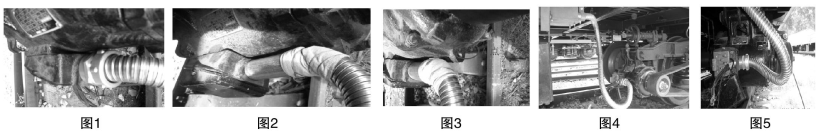 制作一段60mm長的全牙的外絲,將其兩端分別與接線盒和螺接式金屬軟管接頭進行連接?紤]到接線盒與電機外殼空間狹窄,接頭無法旋轉緊固,決定將電機接線盒的緊固螺栓松開,接線盒會略向外遠離電機外殼一些,這樣就給出了足夠金屬軟管接頭旋轉的空間。將軟管接頭旋緊后,保證其凸起處不朝向電機外殼則不會發(fā)生干涉,再將接線盒重新進行緊固即可。由于省去了鍍鋅管的長度,金屬軟管折彎處不再存在超出限界的可能性。至此線束防護完全復合工藝要求,該問題得到了徹底解決(如圖5)。
